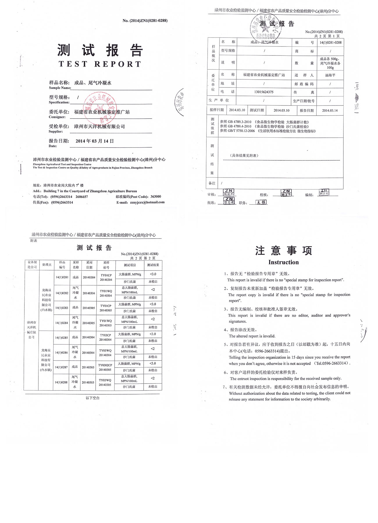 漳州市農(nóng)業(yè)檢驗監(jiān)測中心/福建省農(nóng)產(chǎn)品質(zhì)量安全檢驗檢測中心(漳州)分中心測試報告--成品、尾氣冷凝水檢測