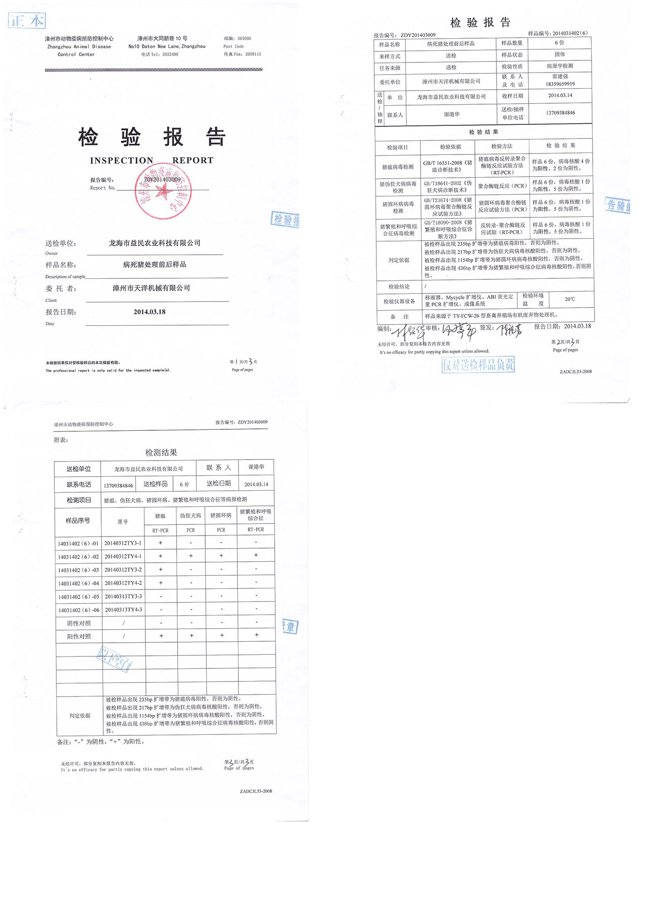 漳州市動(dòng)物疫病預(yù)防控制中心檢驗(yàn)報(bào)告--病死豬處理前后樣本